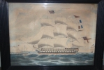 An early 19th century naive watercolour of a fully rigged ship from the English Fleet. It is likely that this painting was painted by a member of the crew and has a naive charm, hence the amateur perspectives. The paper has a degree of browning. The picture is mounted in a contemporary ebonised frame.